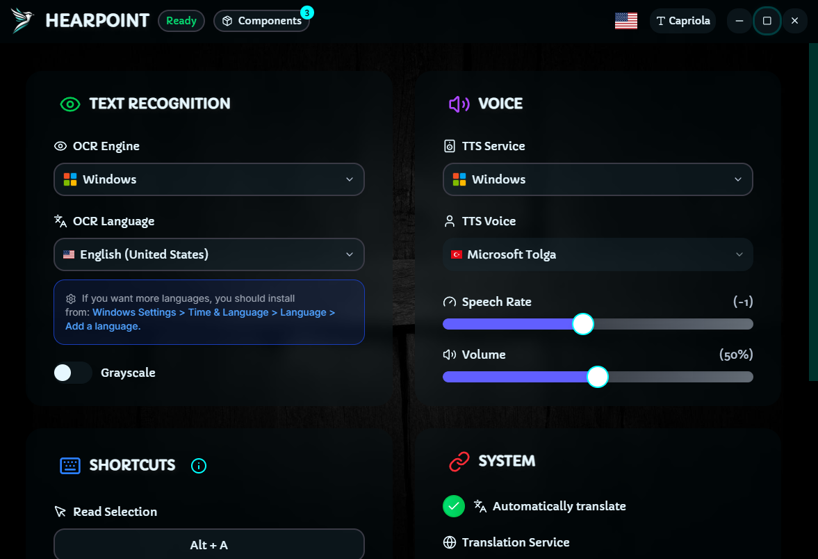 - Translation Support: Optional translation of captured text before speech synthesis