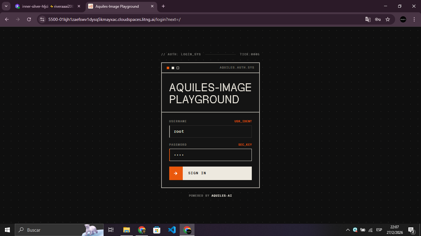 -d '{"model": "stabilityai/stable-diffusion-3.5-medium", "prompt": "a white siamese cat"}'Aquiles-Image ships with a built-in interactive playground for testing image models and monitoring server stats β protected by login to prevent unauthorized access. Enable it with --username and --password: