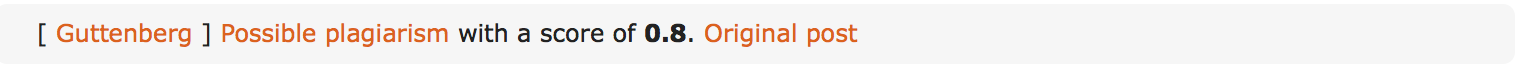 Every 60 seconds, Guttenberg fetches the most recent answers (the "targets") on Stack Overflow. For each of these answers, possibly related posts (for example answers to related questions) are collected. Each related post will be compared with the "target" and the Jaro-Winkler distance will be calculated. If one of the comparison reaches a certain score, a message like this will be posted in chat:
